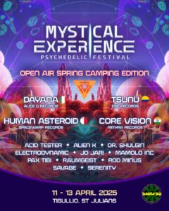 Find out more »Mystical Experience – Psychedelic Festival Spring Camping Edition | April 11-12-13, 2025 | Tigulio A portal to another dimension is opening… will you step through? For three days and nights, join a tribe of dreamers, dancers, and cosmic explorers in an open-air psychedelic adventure like no other. Lose yourself in hypnotic beats, surreal art, and the magic of the great outdoors. This is more than a festival – it's an awakening. WHAT TO EXPECT? ✨ Psytrance & Progressive beats –…
